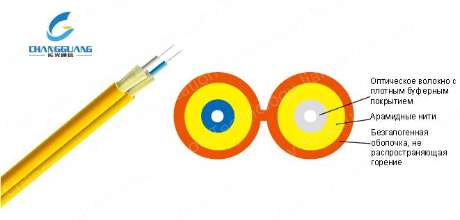 Дуплексный волоконно-оптический кабель с конструкцией в виде восьмерки использует два 900 мкм или 600 мкм волокна с плотным буферным покрытием в качестве элементов оптической передачи, покрывающая снаружи арамидная нить служит силовым элементом, с самой внешней стороны экструдирован ПВХ оболочкой в виде восьмерки. Возможно по запросу клиентов предоставление оболочек из LSZH и других материалов.