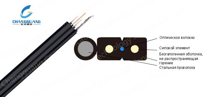 В центре самонесущего ответвительного оптического кабеля рамочного типа GJXFH помещается оптическое волокно, с 2-х сторон помещаются два параллельных неметаллических силовых элемента FRP или стальная проволока, снаружи размещается стальной трос. Затем кабель дополняется огнеустойчивой оболочкой LSZH.