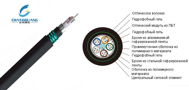 Конструкция кабеля GYTA53: волокна, одномодовые или многомодовые, помещены в оптический модуль, изготовленного из высокопрочного пластикового модуля. Модуль заполнена водоотталкивающим наполнителем. В центре кабеля находится металлический силовой сердечник. Для некоторых кабелей с большим числом волокон металлический силовой элемент покрыт полиэтиленом. Модули (и наполнители) скручены вокруг центрального силового элемента в компактное круглое ядро, щели в сердечнике кабеля заполнены водоотталкивающим веществом. Сердечник кабеля покрывается водонепроницаемой пленкой из полиэтилена с алюминием (APL), затем покрывается внутренней оболочкой из ПЭ. После продольного покрытия водонепроницаемой пленкой PSP экструдируется внешней оболочкой из ПЭ.