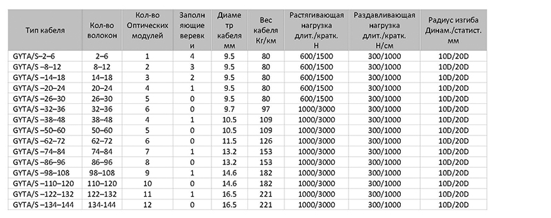 Конструкция кабеля GYTA/S: волокна, одномодовые или многомодовые, помещены в оптический модуль, изготовленного из высокопрочного пластикового модуля. Модуль заполнена водоотталкивающим наполнителем. В центре кабеля находится металлический силовой сердечник. Для некоторых кабелей с большим числом волокон металлический силовой элемент покрыт полиэтиленом. Модули (и наполнители) скручены вокруг центрального силового элемента в компактное круглое ядро, щели в сердечнике кабеля заполнены водоотталкивающим веществом. Сердечник кабеля покрывается водонепроницаемой пленкой из полиэтилена с алюминием (APL), затем покрывается внешней оболочкой из ПЭ.
