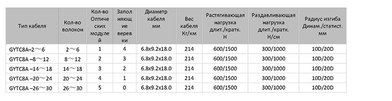 Конструкция кабеля GYTC8A: волокна, одномодовые или многомодовые, помещены в изготовленный из высокопрочного пластика оптический модуль. Модуль заполнен водоотталкивающим наполнителем. В центре кабеля находится металлический силовой сердечник. Модули (и наполнители) скручены вокруг центрального силового элемента в компактное круглое ядро, щели в сердечнике кабеля заполнены водоотталкивающим веществом. Сердечник кабеля покрыт водонепроницаемой пленкой APL, скрученной со стальной проволокой, образуя внешнюю оболочку кабеля из ПЭ в форме цифры 8. Данный вид кабеля имеет широкое применение в самонесущей воздушной прокладке.