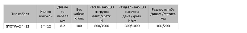 Конструкция кабеля GYXTW: ленточные волокна помещены в оптический модуль, изготовленный из высокопрочного пластикового модуля. Модуль заполнен водоотталкивающим наполнителем. Оптический модуль продольно покрыт пленкой PSP. Между стенкой модуля и пленкой PSP проложен водонепроницаемый материал для обеспечения компактности и продольной защиты от влаги кабеля, с двух сторон размещены две параллельные стальные проволоки, после чего покрывается оболочкой из ПЭ.